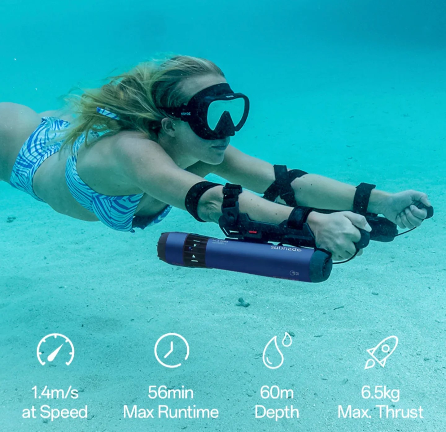 Encased in an aluminum alloy body and equipped with a unique jet propulsion design, subnado can easily reach the forward speed of up to 1.4m/s, giving you the ultimate underwater thrill. In addition, if you are a deep-diving enthusiast, the subnado, with a maximum diving depth of 60m, is your best scuba diving scooter choice.